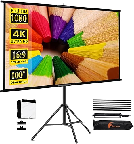 Projector Screen with Stand,Towond 100 inch Indoor Outdoor Projection Screen, Portable 16:9 4K HD M